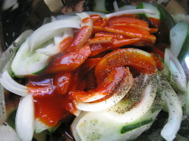 Dưa leo 3 trái, xắt xéo, cho vào cái bác to. Củ hành tây 1/4 xắt ra, cho vào chung với dưa. Bỏ thêm một ít tiêu, tương ớt chua ( chua chua ngọt ngọt ), một ít tỏi bằm vào trộn đều, rắt mè lên trên ... trộn dưa nhẹ tay và không nên nêm muối***